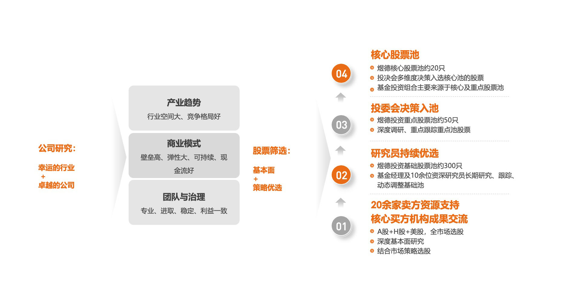 实践证明通过系统化、流程化的深度研究可以有效地发现价格与价值的背离。同时,基本面深度研究也是基金运作中最有效的风险控制手段。煜德投资奉行基于价值判断的成长型投资,积极寻找经济和社会变迁中有巨大发展潜力的行业和公司,通过分享企业业绩的成长,为投资者创造收益
